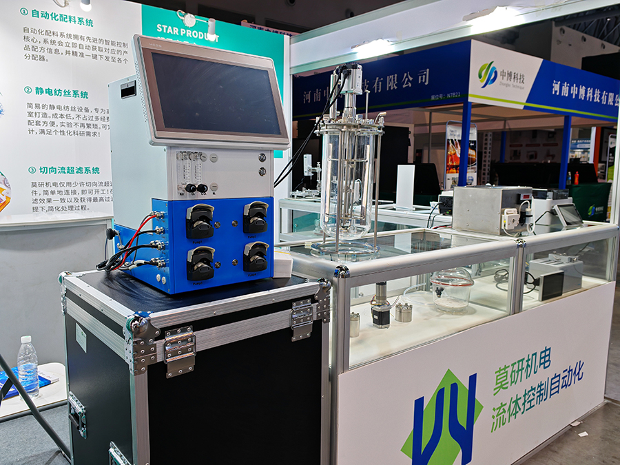 展會(huì)現(xiàn)場(chǎng),莫研機(jī)電的展位號(hào)為 N7A22,精心陳列了滴定儀、生物發(fā)生器、蠕動(dòng)泵、注射泵等多款先進(jìn)儀器,以及靜電紡絲系統(tǒng)、切向流系統(tǒng)、稱重分裝系統(tǒng)等系統(tǒng)應(yīng)用。其中,自動(dòng)化配料系統(tǒng)與生物反應(yīng)器系統(tǒng)堪稱明星展品。自動(dòng)化配料系統(tǒng)以其先進(jìn)智能控制核心驚艷全場(chǎng),能迅速獲取產(chǎn)品配方信息,并一鍵下發(fā)至各分配器。FKE - A5 全自動(dòng)生物反應(yīng)器作為生物反應(yīng)器系統(tǒng)代表,高精度 DO 控制與全自動(dòng)過程控制能力,為高校實(shí)驗(yàn)及科研工作筑牢堅(jiān)實(shí)技術(shù)支撐,其簡(jiǎn)潔界面與自由擴(kuò)展性能,深度契合科研個(gè)性化需求,有力推動(dòng)實(shí)驗(yàn)進(jìn)程。