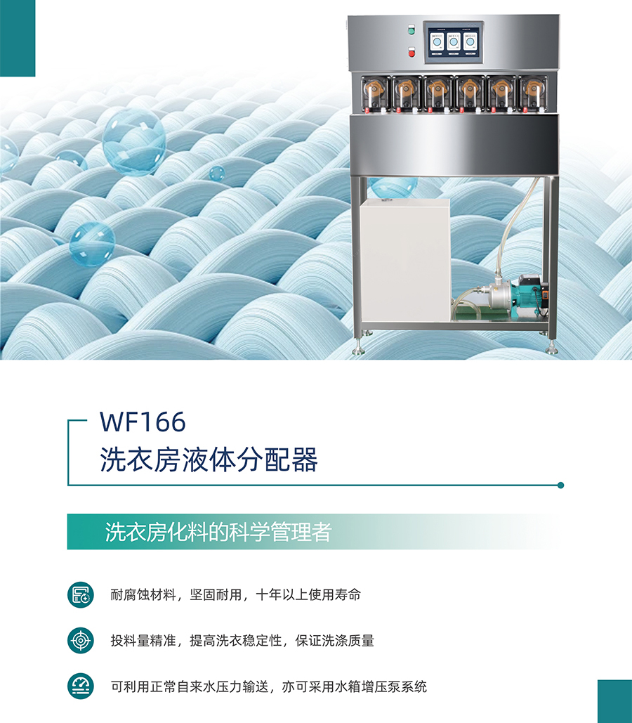 洗衣房液體分配器是洗衣房化料的科學(xué)管理者,致力于解放人力,提高洗衣質(zhì)量。配合液體分配器自動(dòng)投放液體化料,通過編程,可實(shí)現(xiàn)與洗衣機(jī)同步,在不同的洗衣程序時(shí)自動(dòng)投入相應(yīng)的洗衣化料至洗衣機(jī)中,實(shí)現(xiàn)真正意義的洗衣過程全自動(dòng)。隨著越來越多的洗衣廠、洗衣房選擇液體洗衣化料及政府對(duì)無磷化的控制,更多的用戶會(huì)選擇液體洗衣化料。這是一種更方便、更環(huán)保的選擇。
