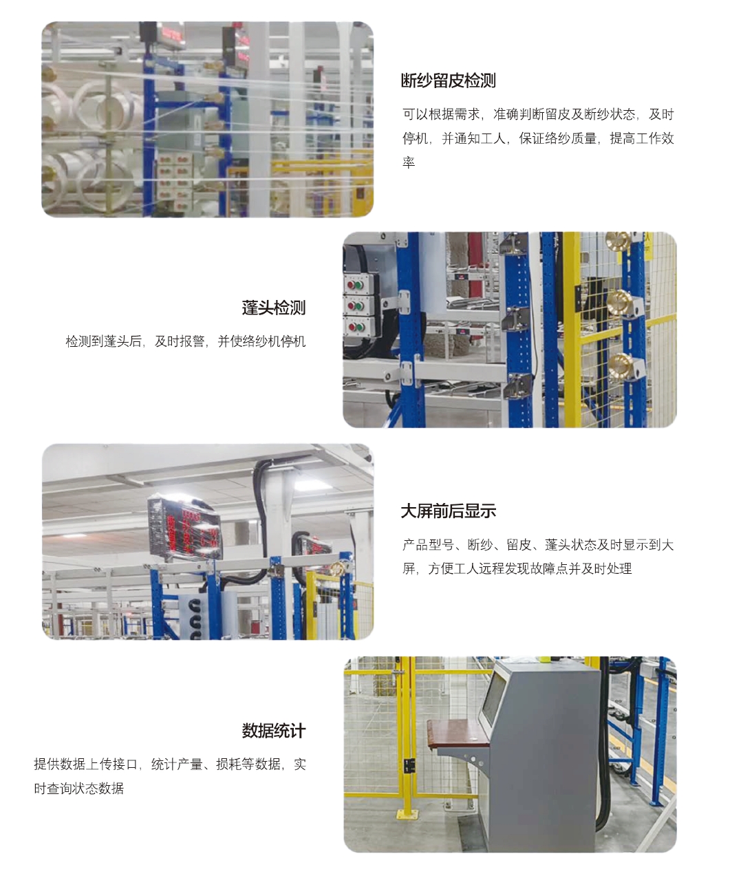 1、智能紗架與絡(luò)紗機(jī)、涂油系統(tǒng)聯(lián)動(dòng),在出現(xiàn)斷紗、亂紗、留皮、誤操作時(shí)停機(jī)的功能,配合機(jī)械臂自動(dòng)上紗,具備產(chǎn)量統(tǒng)計(jì),分析,檢測等功能。